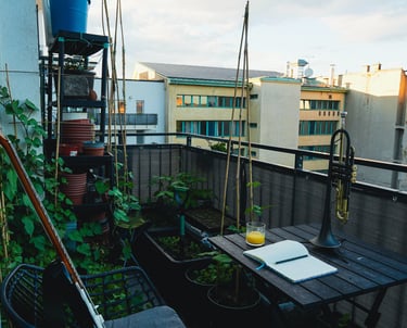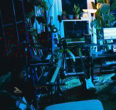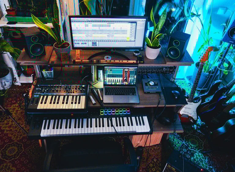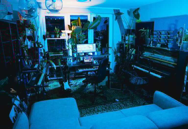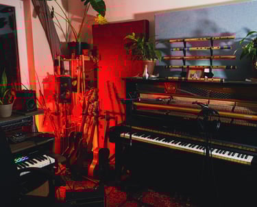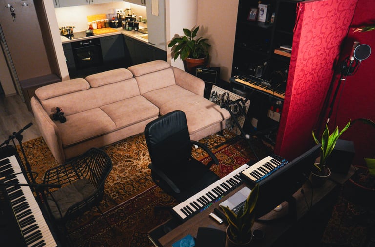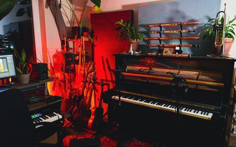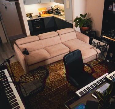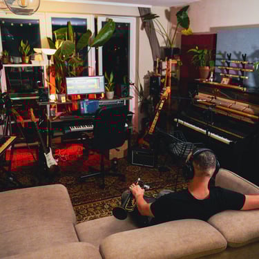 Welcome to my home studio, nestled in the quiet center of Budapest. It features a big balcony and garden, a grand piano, comfy sofa, and a variety of instruments, including guitars. The studio is filled with lots of plants, creating a homey atmosphere that enhances the creative process. Equipped with top-notch production software and high-quality recording equipment, I provide everything you need to bring your musical vision to life. Enjoy refreshments and decent coffee while working in a space that feels like home but maintains a professional atmosphere.