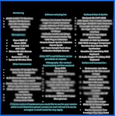 I have a large selection of software and analogue instruments at the studio from a selection of guitars, upright piano, analogue synths, a large microphone collection and outboard gear.